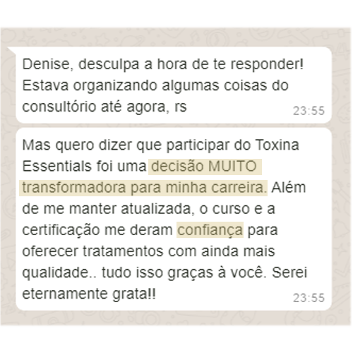 Hoje, com seis anos de experiência na área e um consultório que fatura 100 mil reais por mês, meu objetivo é capacitar outros profissionais a alcançarem o mesmo sucesso, fornecendo-lhes as ferramentas e o conhecimento necessário para se destacarem no mercado através do Curso TOXINA ESSENTIALS.